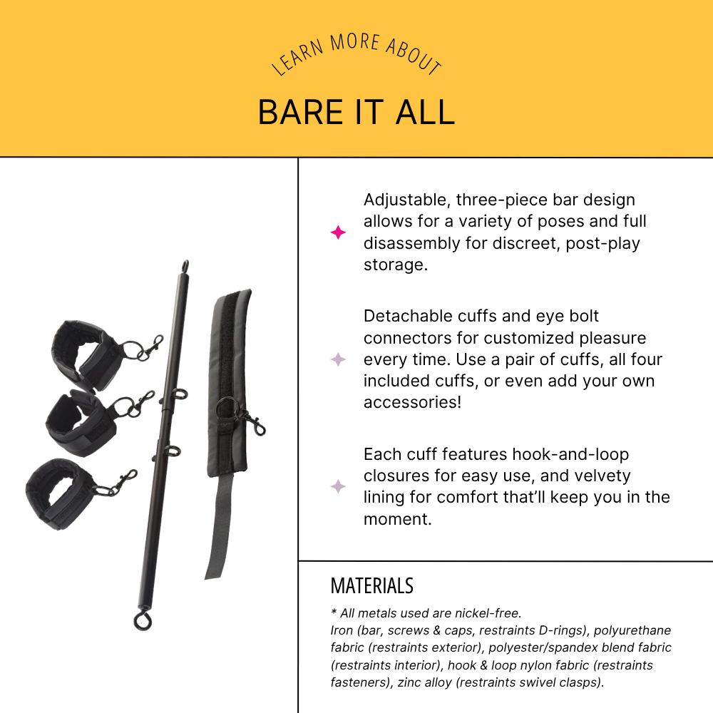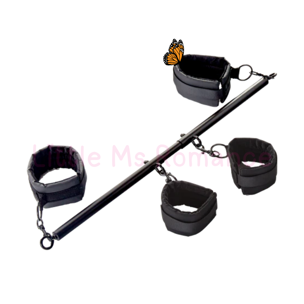 Submit to lust and bare it all with this bar set. The four included cuffs and expandable bar allow for simple control or a variety of compromising positions. Feel the soft cuffs against your skin as your partner tightens them around your wrist, ankles, or both. Give in to their control as the bar extends, holding you in place. Passion, power, and pleasure collide in an unparalleled experience.