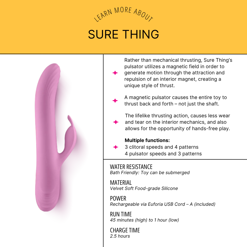 It may look familiar, but this feature-packed dual-action bedroom tool isn't like other vibrators. With a vibrating rabbit teaser and unique pulsator thrusting action, Sure Thing is one unforgettable ride.