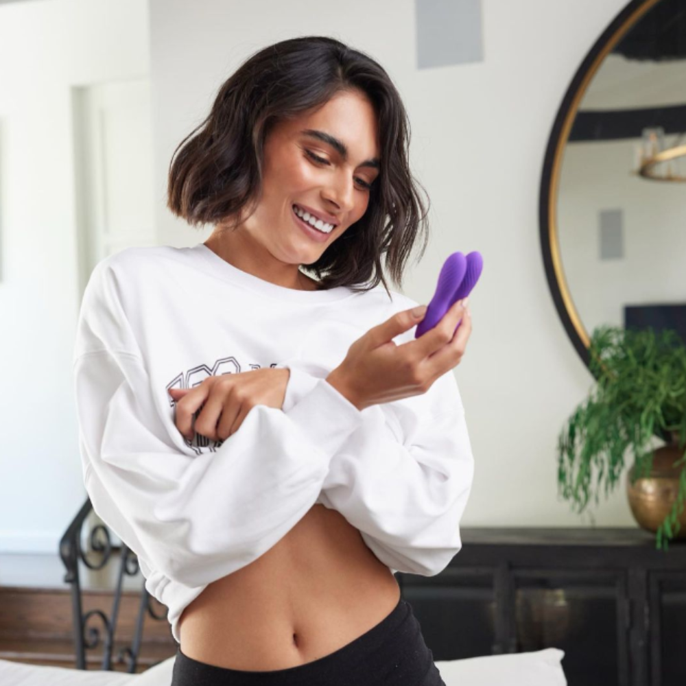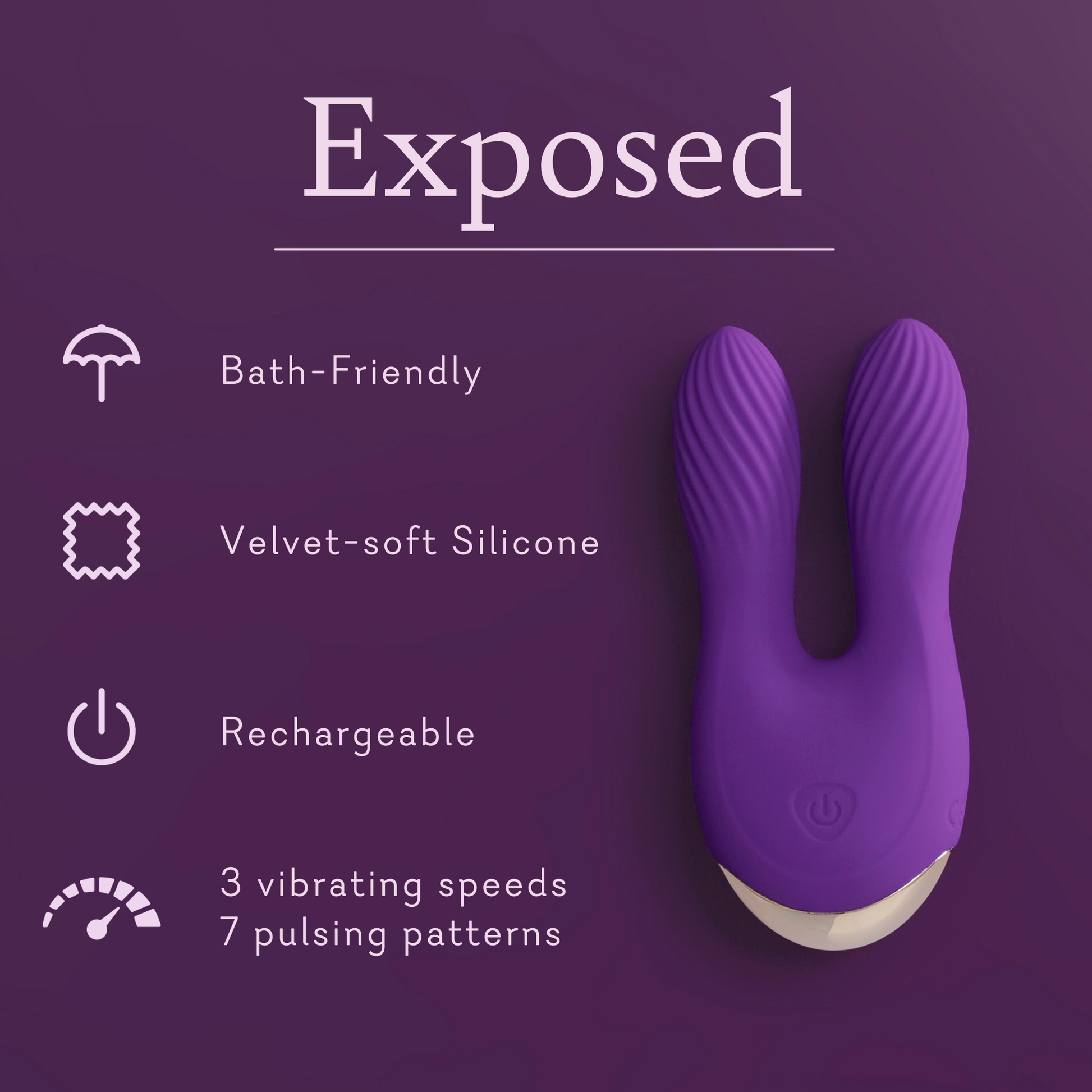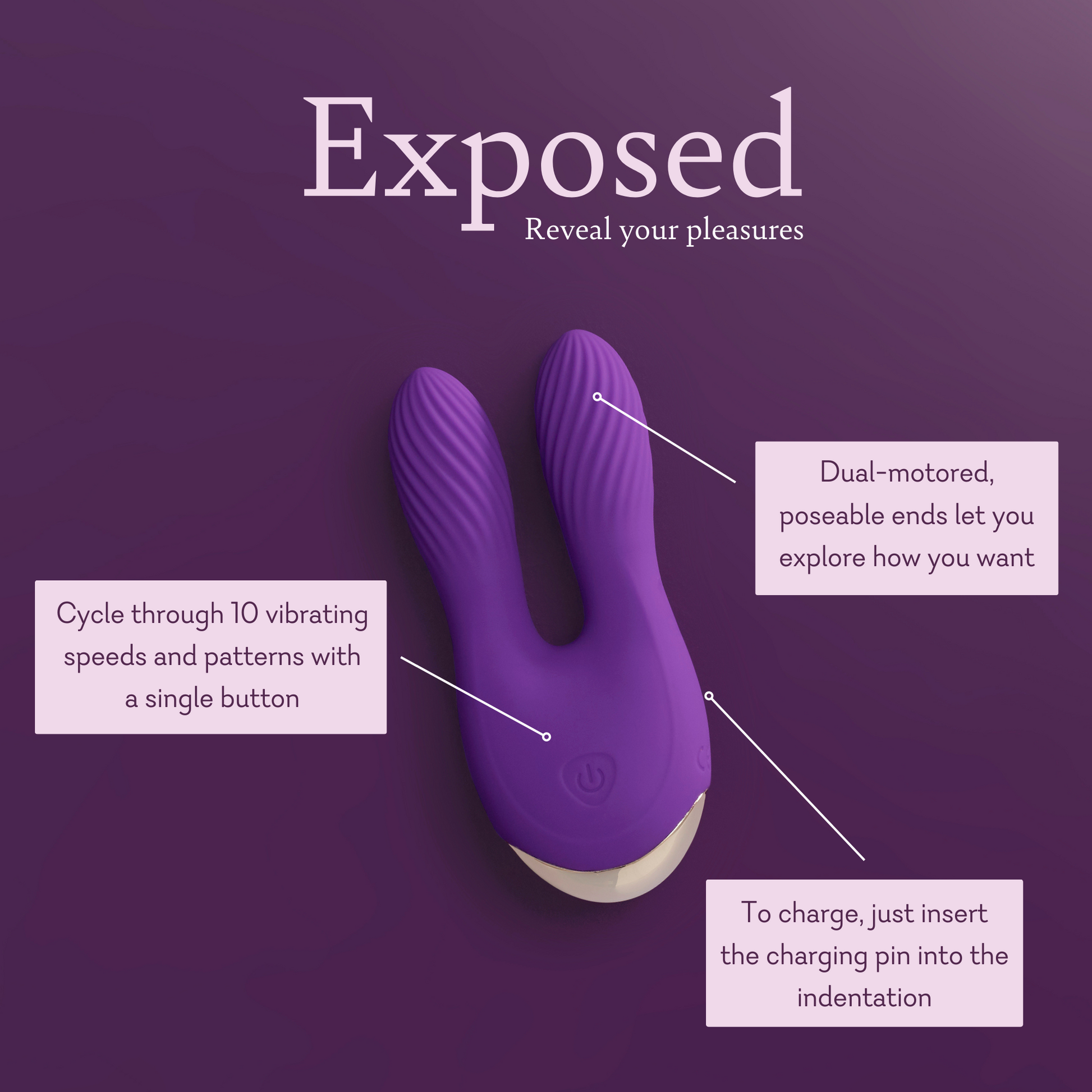 Reveal your pleasures day or night with Exposed, a firm yet flexible clitoral vibrator with dual ends that hold position once you pose them. Move the ends closer together for tantalizing pressure or pose them farther apart to tease multiple spots all at once. Dual motors vibrate in 10 speeds and pulsing patterns for breathtaking ecstasy no matter what shape your desires take.