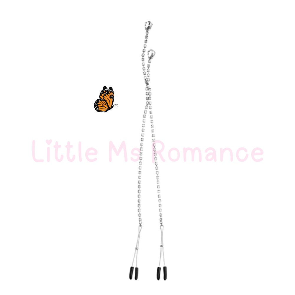 It feels good to be under pressure with the Onyx Clamps. These luxurious clamps feature rubber tips to protect skin while stimulating the nipples with sensual pressure. The Onyx Nipple Clamps are connected by a rhinestone chain and two teardrop gems that tickle the skin between bare breasts. Whether it’s for solo play or with a partner, these clamps put sexy seduction within reach.
