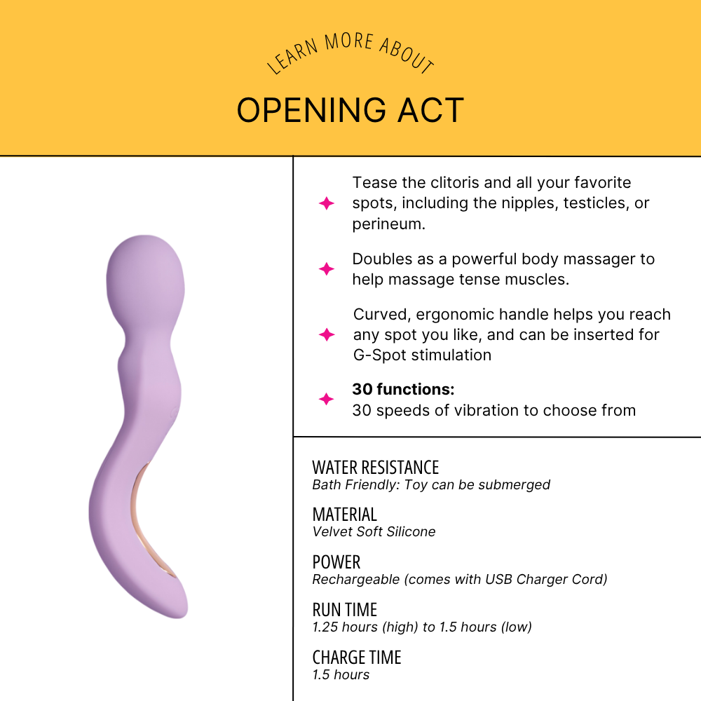 Opening Act is contoured for your pleasure with 30 spellbinding vibrations and pulsing patterns. Ergonomically designed, this silicone wand vibrator is designed to stimulate the clitoris, or it can be used internally. You can also dance it down your every curve for a thrilling full-body massage. Try it in the bedroom or the bath and play any way you wish.