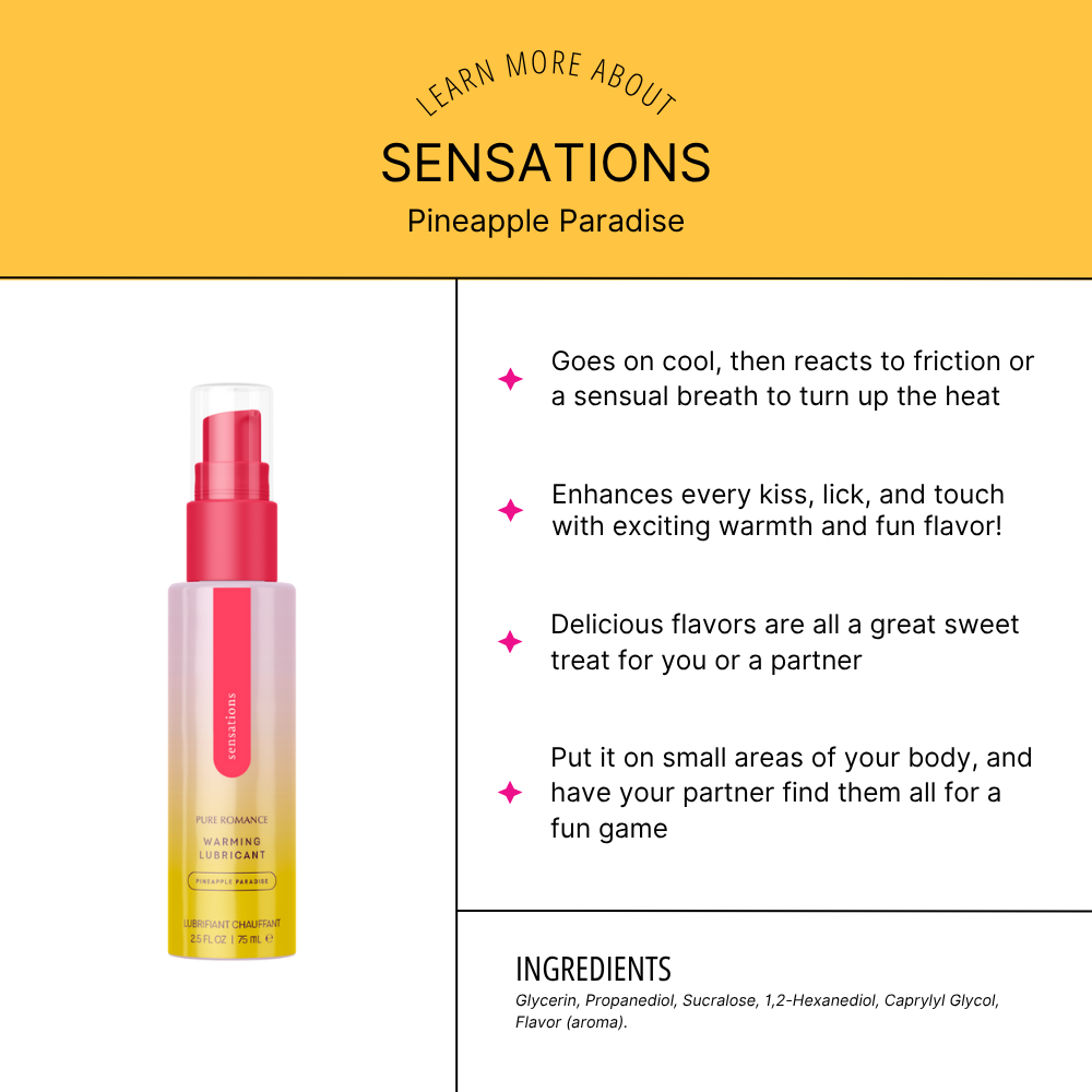 Some like it hot, especially when every kiss, lick, and touch is enhanced with the tantalizing heat of Sensations, our delectable warming lubricant with an air-activated formula reacts to friction and warm breath. Out of the bottle, this playful lubricant feels cool on your skin, but add your warm breath and a little friction to turn up the heat and give foreplay a fun and tasty twist